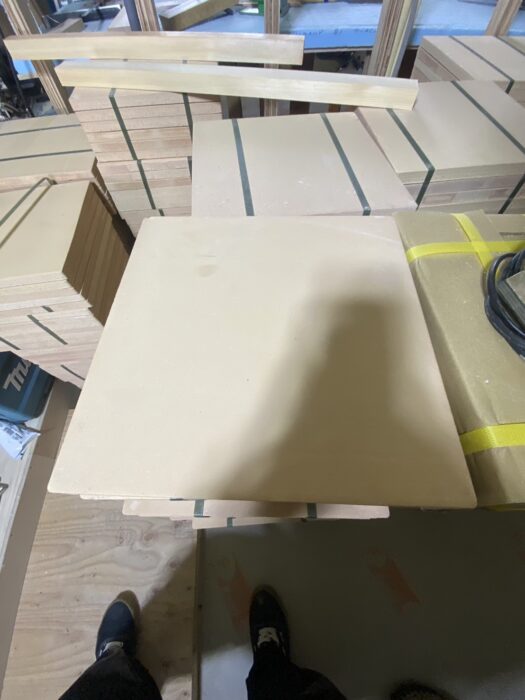 形やサイズが微妙に異なるので並びや貼る向きは現場判断とし、メンテナンス性を考えて撥水加工も施すことに。