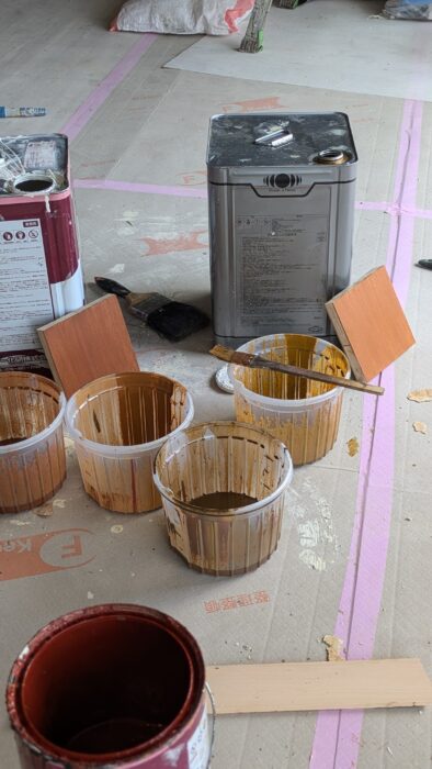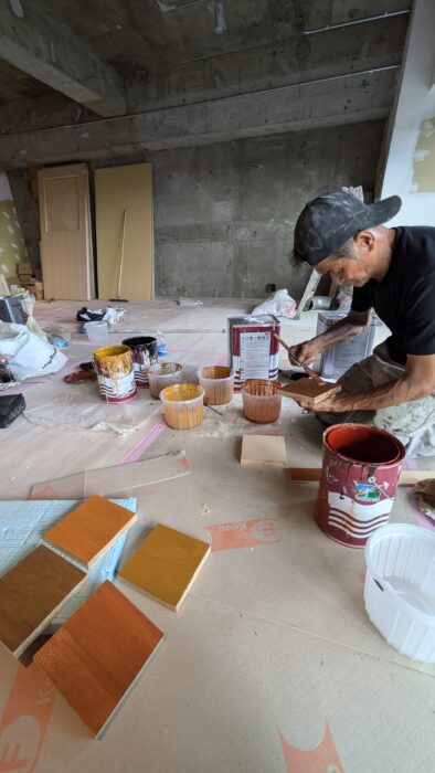 造作家具やドアも多数ありましたので、現場で職人さんと調色し、オリジナルの色を検討。