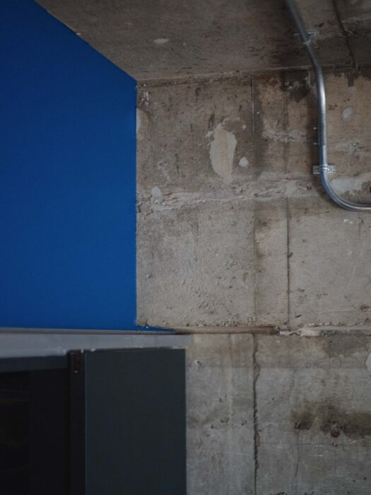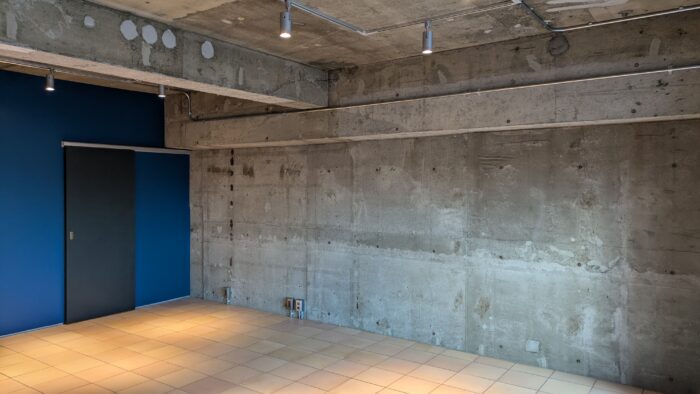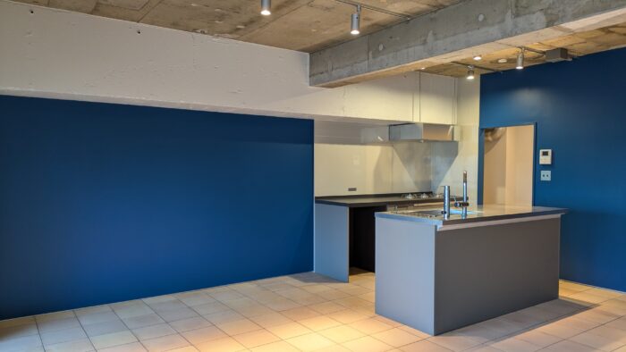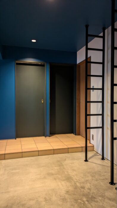 深海を思わせるディープブルーを玄関全体とリビングの一部に。リビングの天井と一面の壁は躯体現しにすることとしました。